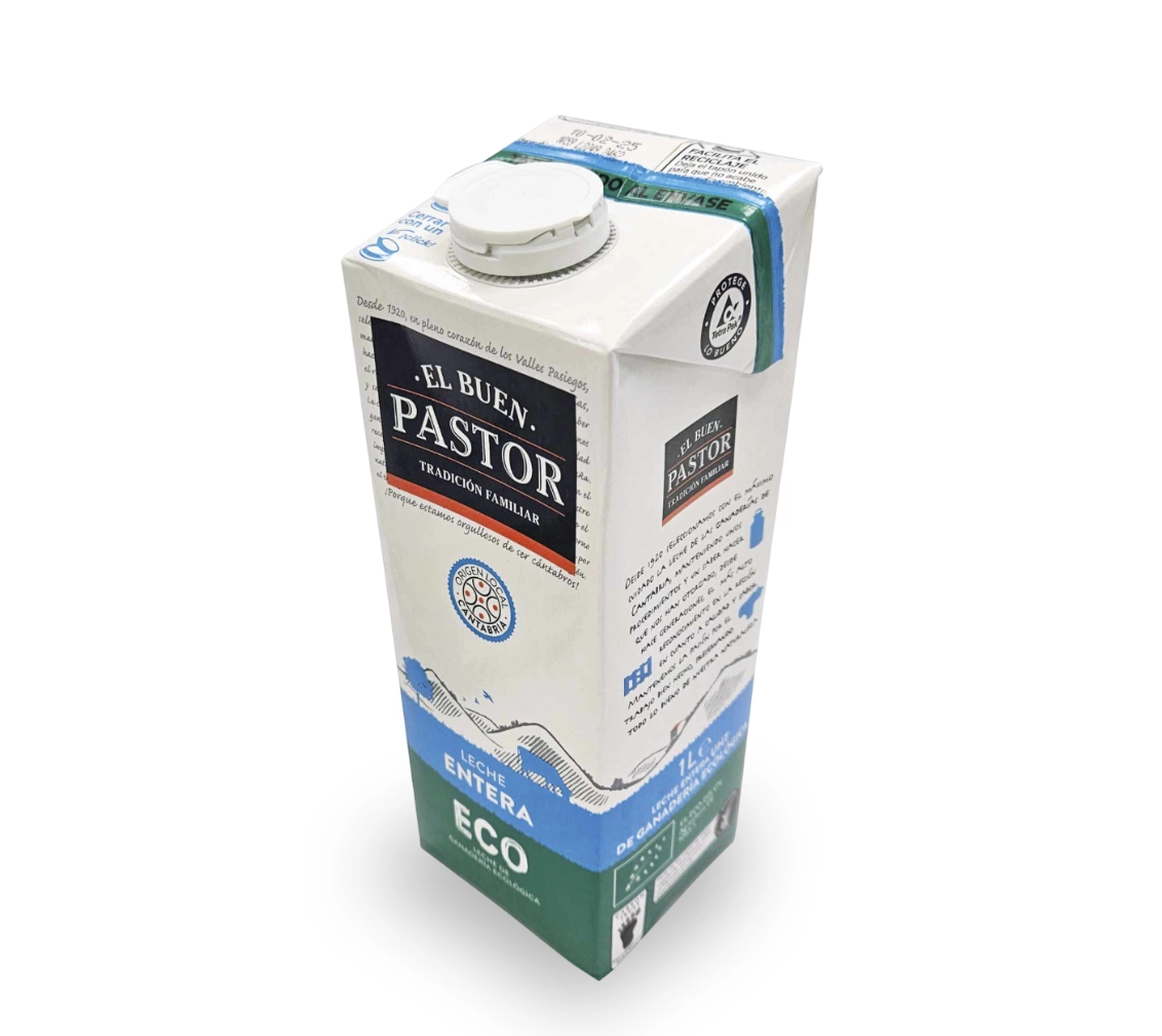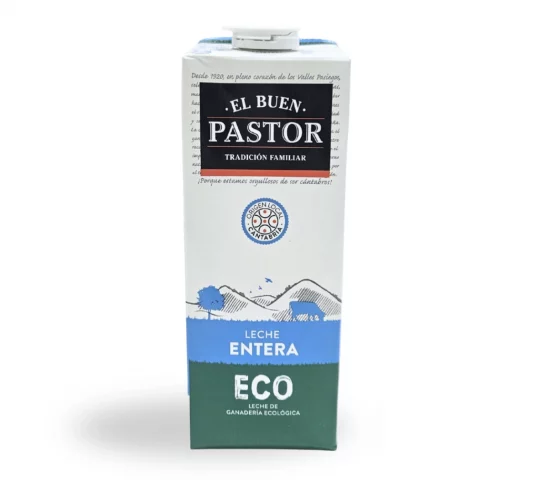 Leche entera ecológica, con todos los nutrientes y sabor, ideal para familias que buscan una leche de gran calidad.